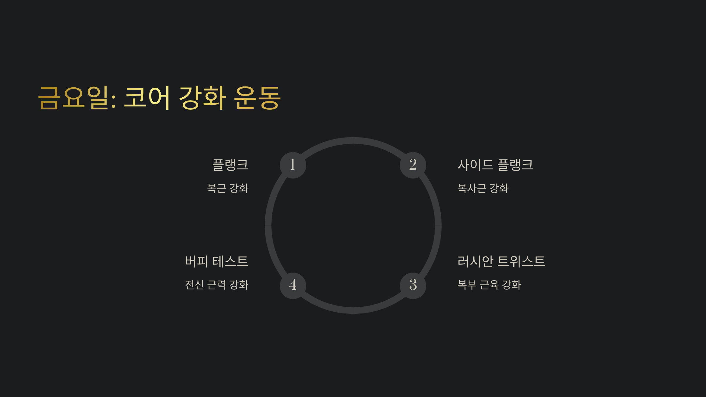 금요일은 코어 근육을 집중적으로 단련하는 날이에요! 🏋️♂️ 코어가 강하면 몸의 균형이 좋아지고 허리 부상을 예방할 수 있어요.